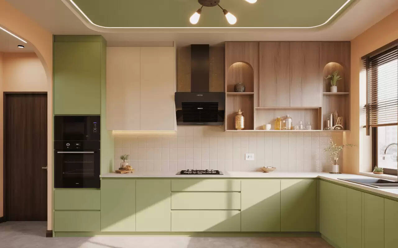 Colour-accent POP ceilings add colour to 2025 kitchens. The ceiling is the centre of attention in terms of soft pastel borders, colourful recessed patterns, or dual-tone effects. Popular colours are sky blue, peach, mint green, and matte gold. These accents go well with neutral furniture. The colours are beautiful and cool with POP finishes that do not overwhelm the design of the kitchen.