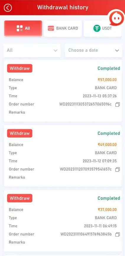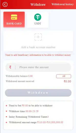 - Recharge: Add funds through Local UPI, USDT, or TRX by selecting the recharge option, choosing the preferred method, and confirming the transaction.