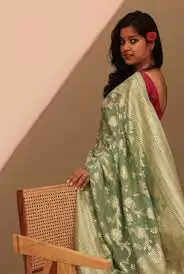 These sarees have a lightweight and transparent fabric, adorned with delicate Banarasi motifs. -
